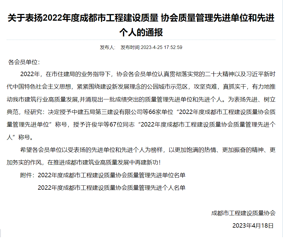 近日,成都市工程建設質量協會《關于表揚2022年度成都市工程建設質量協會質量管理先進單位和先進個人的通報》正式發布,中誠投建工集