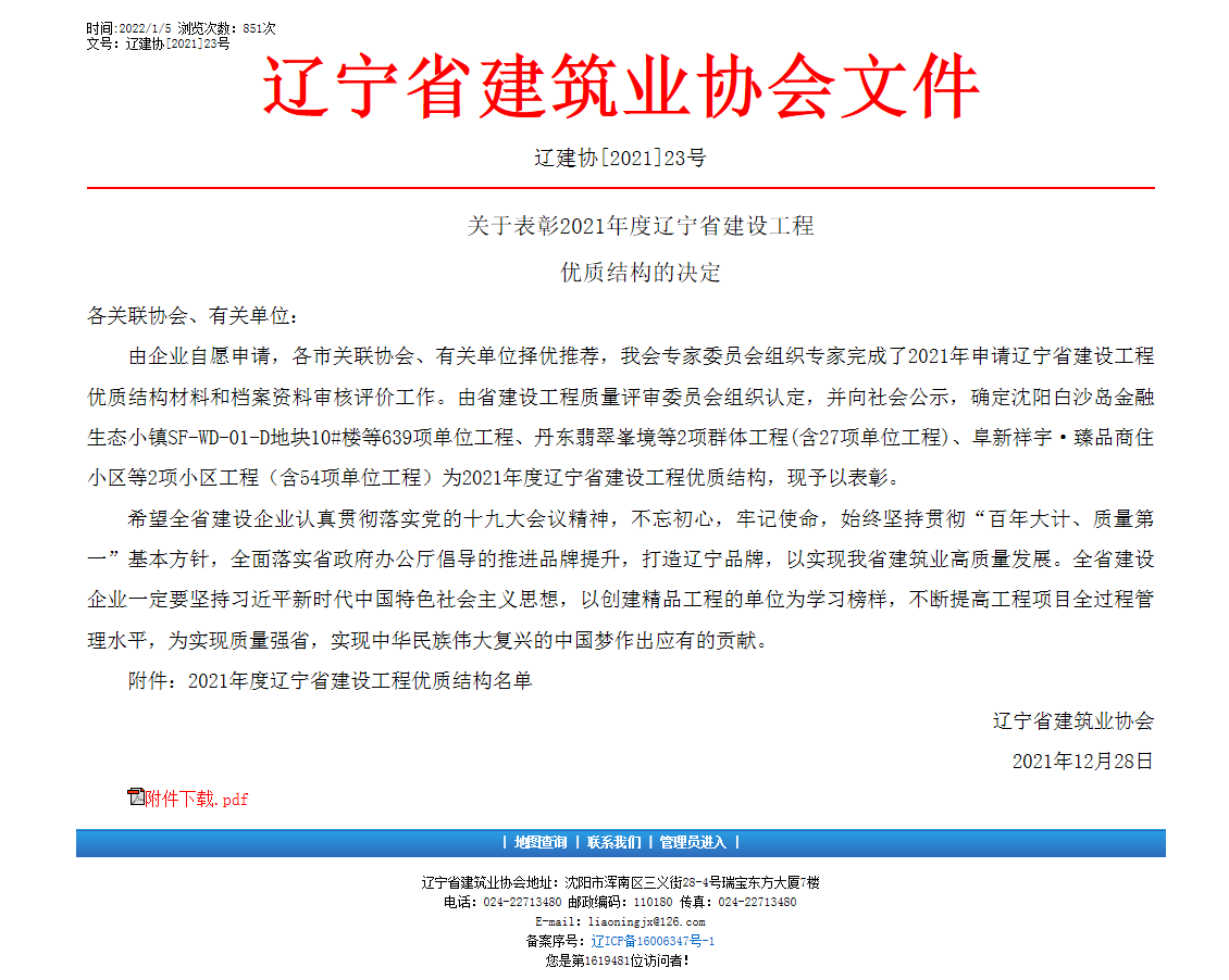 遼寧分公司項目獲評2021年度遼寧省建設工程優質結構稱號