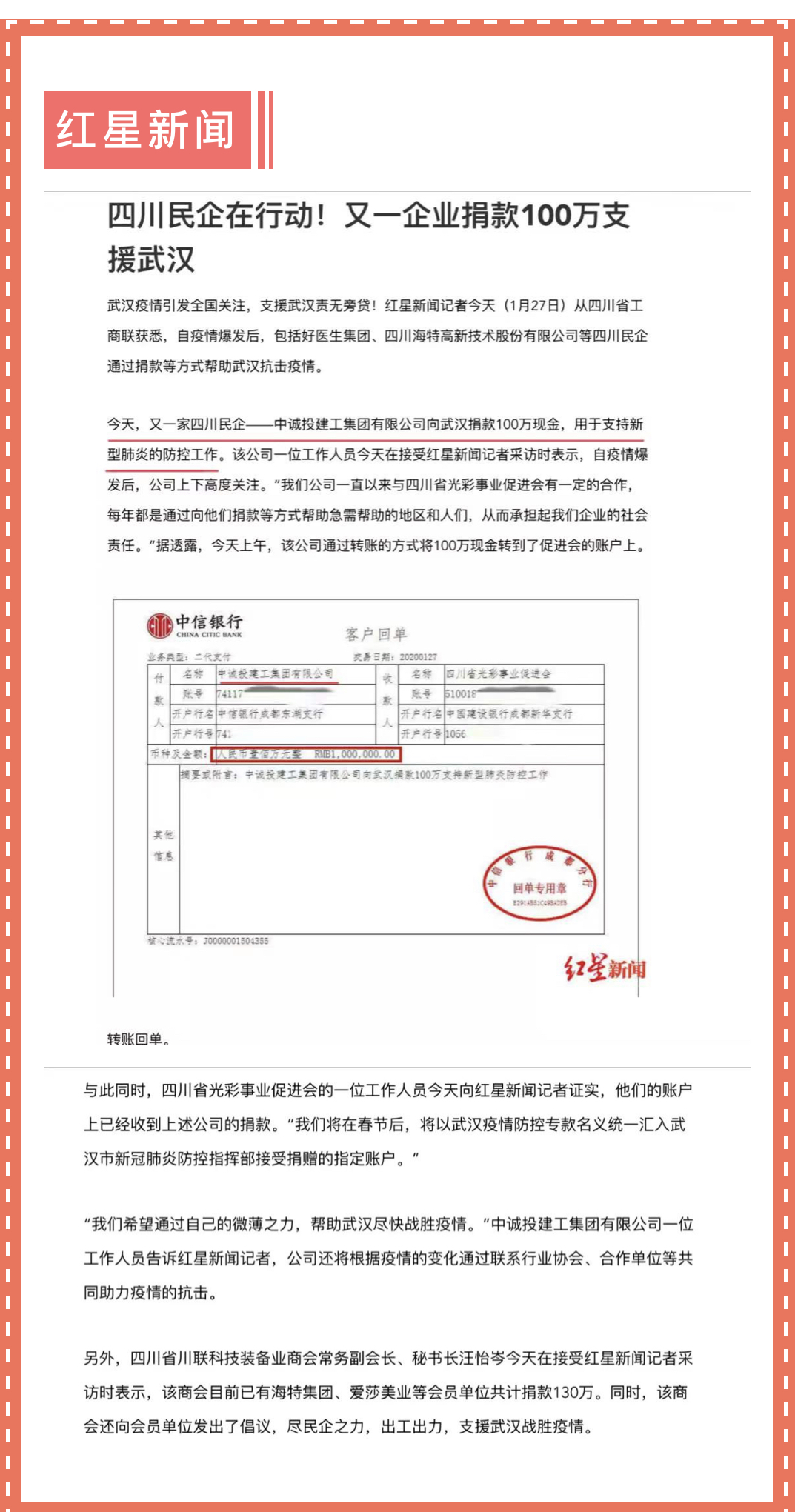 全國多家媒體報道中誠投建工集團向武漢捐款的擔當善舉