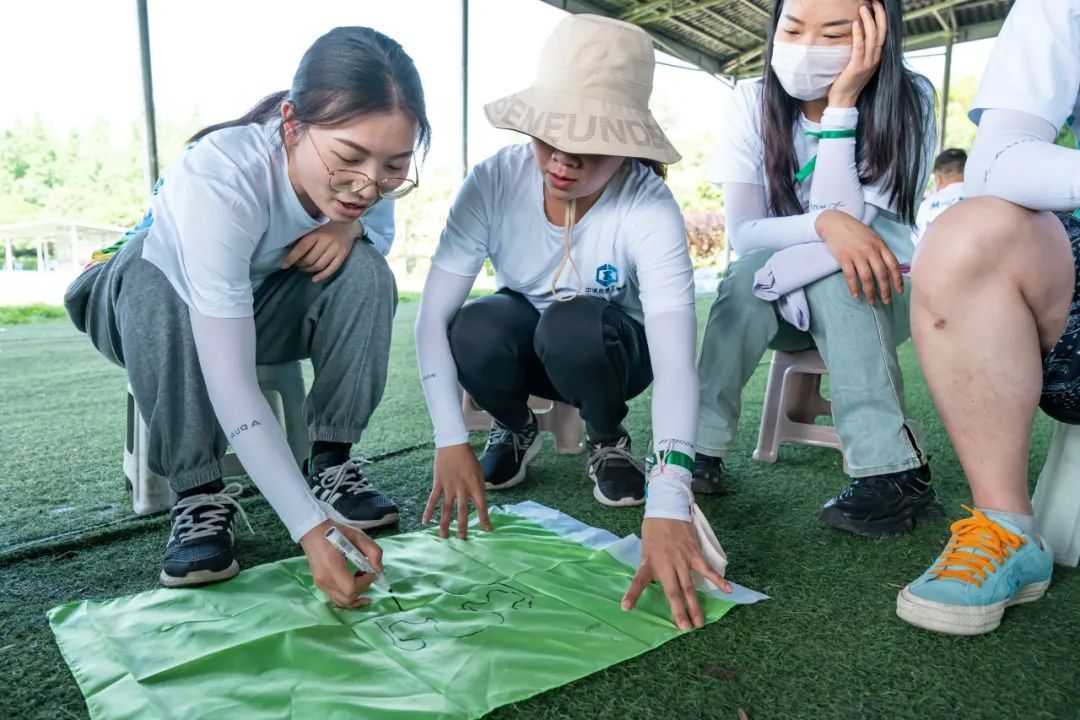 迎著朝陽,聞著花香,大家熱情洋溢、激情四射。經(jīng)過簡單的熱身活動后,在教練的指揮下,大家迅速組成8支隊伍。選隊長、畫隊旗、喊口號、唱隊歌,擺隊形,活動現(xiàn)場氛圍一下子就熱鬧了起來。“我要飛得更高,飛得更高……”“團結(jié)就是力量……”“葫蘆娃,葫蘆娃,風(fēng)吹雨打都不怕……”飛盤拓展項目在各隊嘹亮的隊歌聲中拉開帷幕。