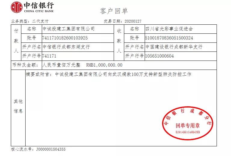 1月27日,這筆捐款已經匯入四川省光彩事業促進會的專款賬戶,隨后再由四川光彩事業促進會以武漢疫情防控專款名義統一匯入武漢市“新冠肺炎防控指揮部”接受捐贈的指定賬戶。