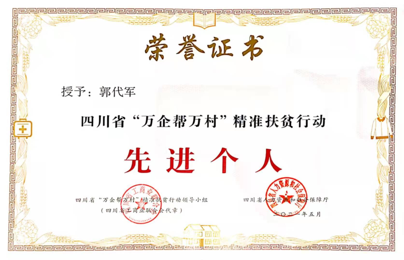 中誠投建工集團有限公司董事長郭代軍榮獲“四川省‘萬企幫萬村’精準扶貧行動先進個人”稱號。