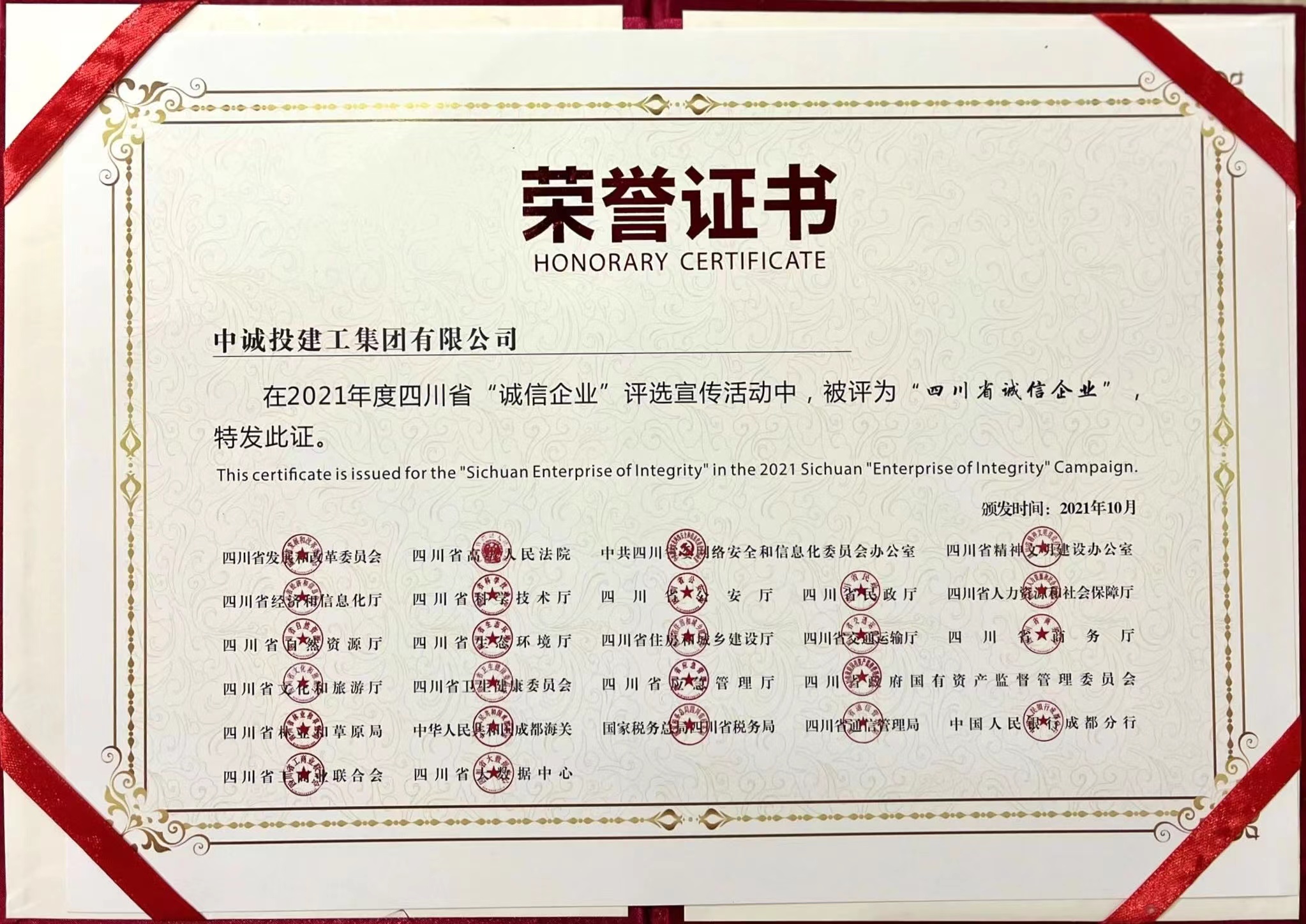 近日,由四川省發(fā)展和改革委員會、四川省經(jīng)濟和信息化廳、四川省自然資源廳、四川省工商業(yè)聯(lián)合會、四川省高級人民法院等25個部門聯(lián)合舉辦的2021年度四川省“誠信企業(yè)”評選活動中,中誠投建工集團榮膺四川省“誠信企業(yè)”稱號。