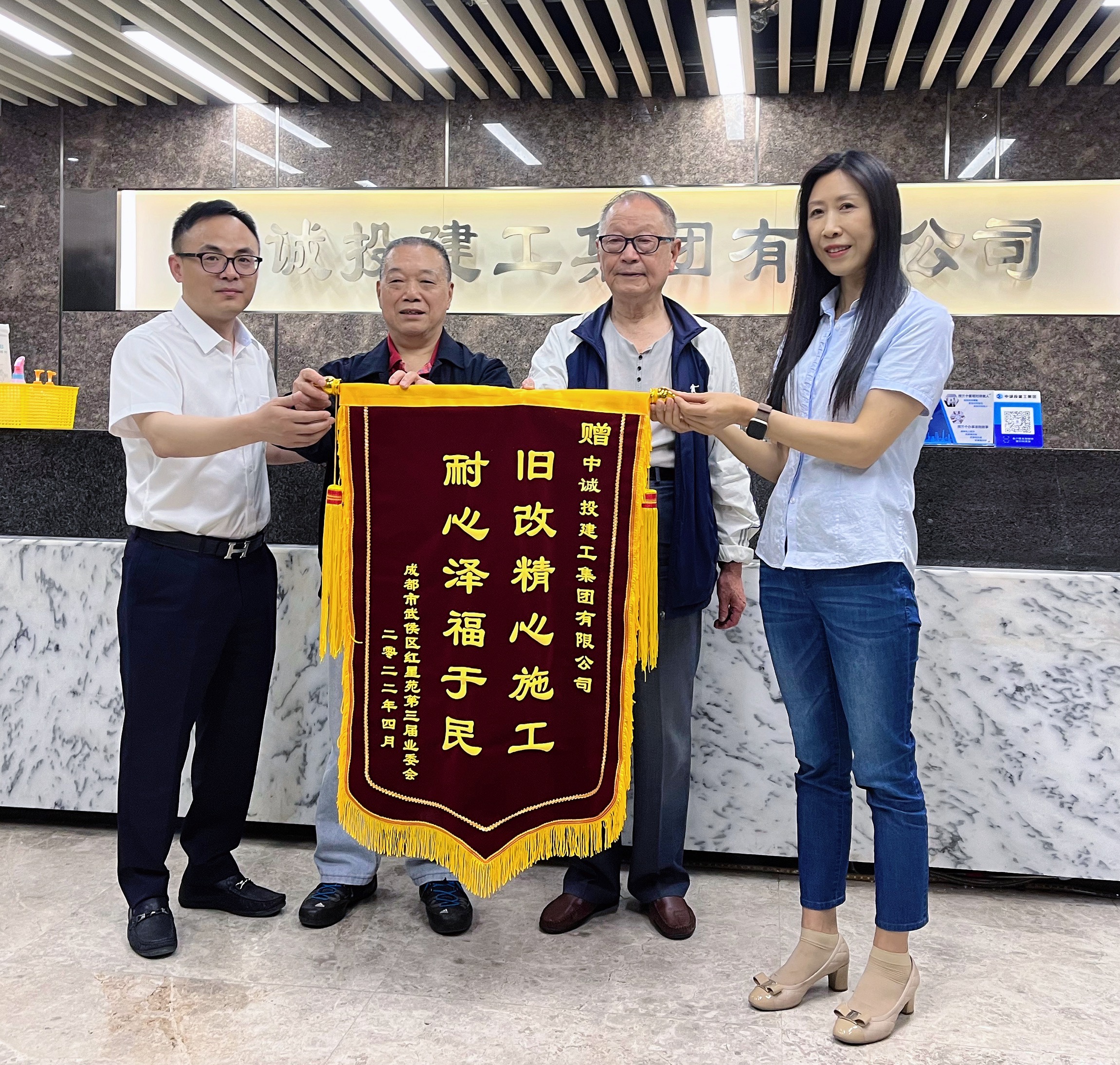 4月25日上午,成都市武侯區(qū)紅星苑小區(qū)居民代表卞先生和江先生將一面寫有“改造精心施工 耐心福澤于民”的錦旗送到中誠投建工集團,對集團公司在承建音樂坊范圍老舊院落改造中,始終堅持傾力為居民辦實事解決實際問題,匠心施工保證工程質量的工作態(tài)度和工作作風表示真誠的感謝。