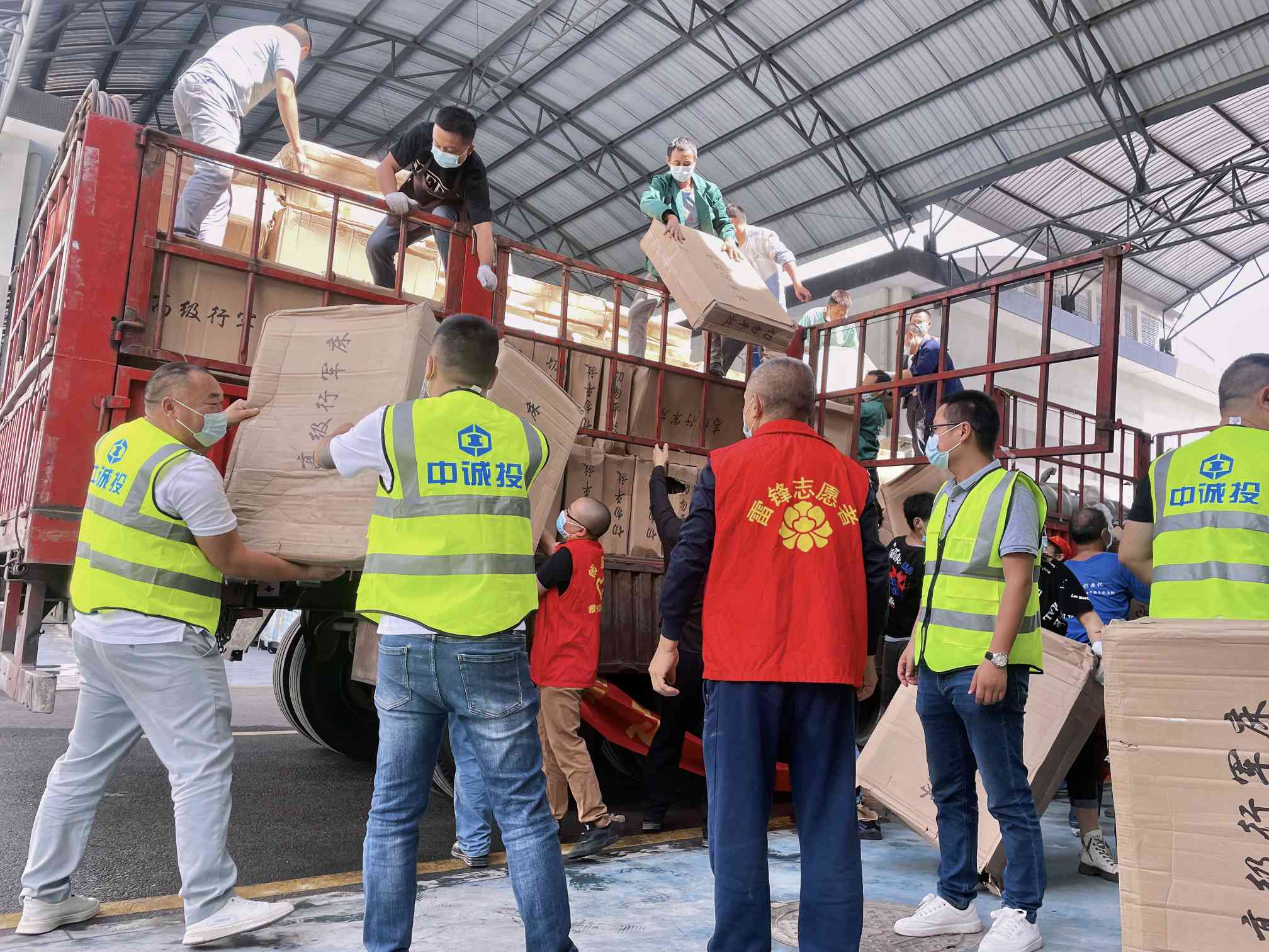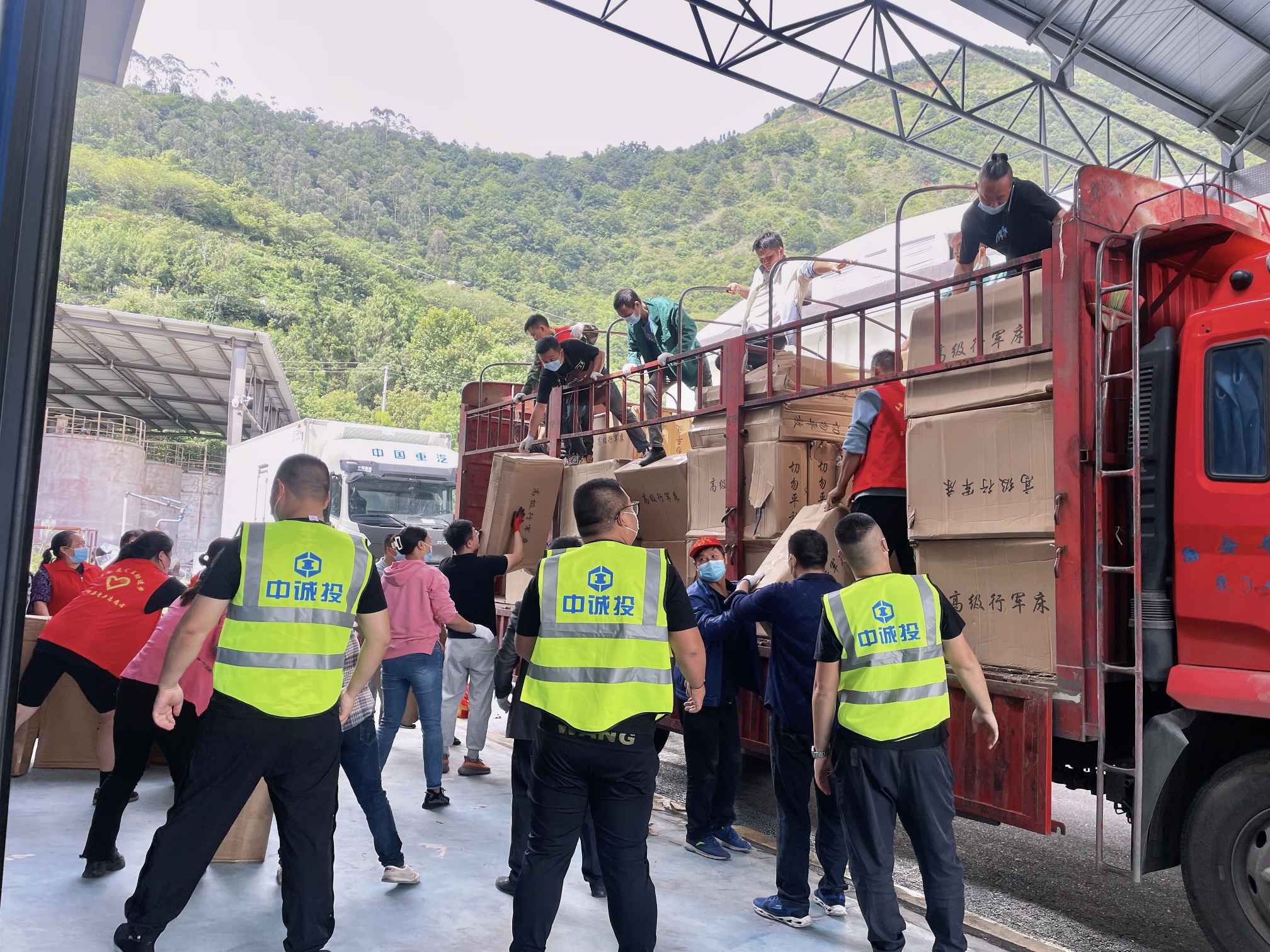 “中誠投建工集團捐贈物資已達到石棉縣紅十字備災救災中心,請大家做好卸貨準備!”9月10日上午,兩輛滿載救援物資的大卡車已達到雅安市石棉縣紅十字備災救災中心,中誠投建工集團總裁彭偉帶領抗震救災行動小組正在緊張有序地搬運資。