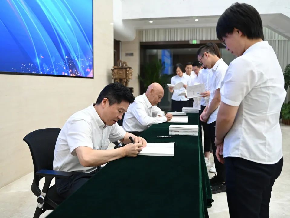 隨后,董事長郭代軍、高級顧問段昌平為大家簽名贈書。儀式現場,大家紛紛圍繞在簽書桌旁,等待獲贈由二位領導親筆簽名的《文化在企業》。當雙手接到新書的那一刻,大家心中的感激和欣喜之情油然而生,紛紛表示將認真汲取《文化在企業》書中的精神養分,勇于探索,砥礪奮進,向著創建值得信賴的百年建筑企業美好愿景努力前行。