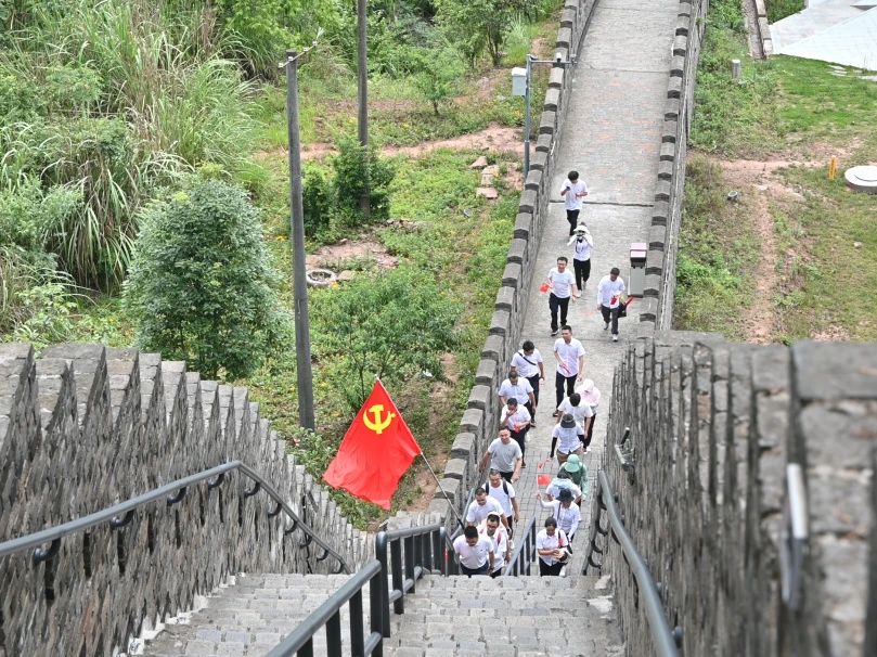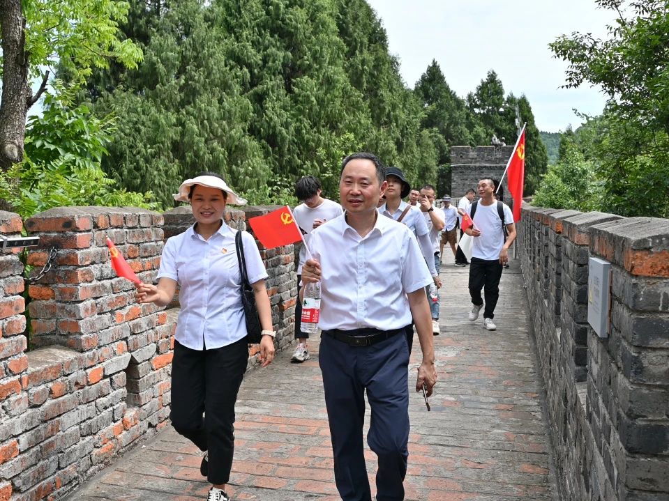 驕陽似火,卻抵擋不住大家追尋長城精神的腳步。下午3點,全體人員在金龍長城腳下集結(jié),個個精神抖擻、不畏酷暑、不懼艱難,整裝待發(fā)。“讓我們拿出紅軍長征二萬五千里的精神,攀長城,登高峰,在心手相依中學(xué)習(xí)百年黨史,銘記革命精神!”隨著黨委書記張阜文的一聲令下,大家士氣高昂,邁著整齊步伐,向著長城進(jìn)發(fā)。