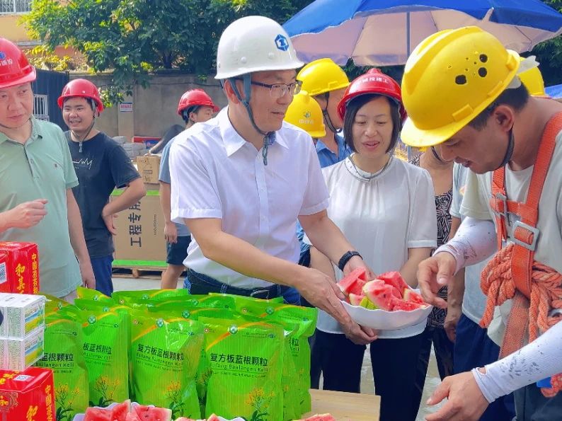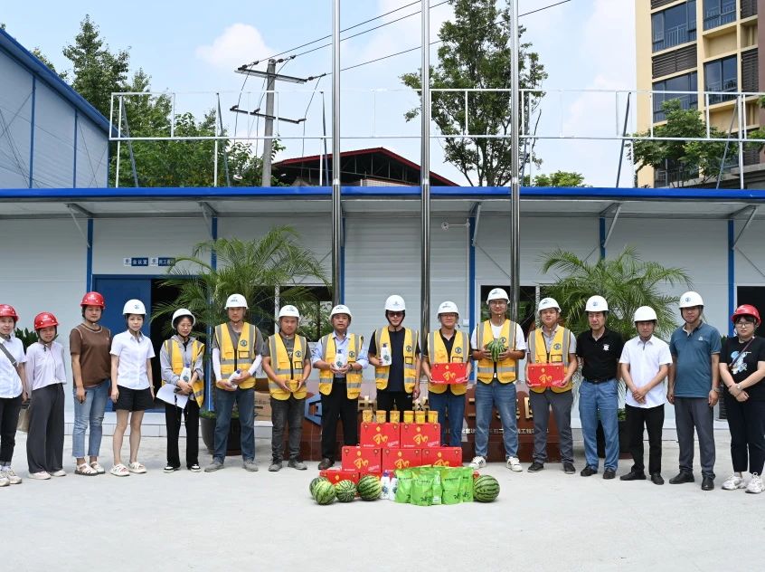 活動中,各慰問小組分別來到華府片區、西部新城、江安河、金康花園、南村公寓、三利廣場、綜保區文化長廊及崇州市城市污水處理廠等成都市內及周邊在建工程項目,為施工一線的員工送去了西瓜、藿香正氣液、板藍根顆粒、涼茶、洗護用品等防暑降溫物資。同時,各小組深入施工現場詢問了解一線員工工作、生活情況,對他們不畏高溫酷暑、堅守崗位、甘于奉獻的勞動精神表示衷心的感謝,并鼓勵大家繼續發揚拼的精神、闖的干勁,弘揚工匠精神,在有序推進項目建設的同時,時刻注意防暑降溫,提高安全生產意識,確保平安度夏。
