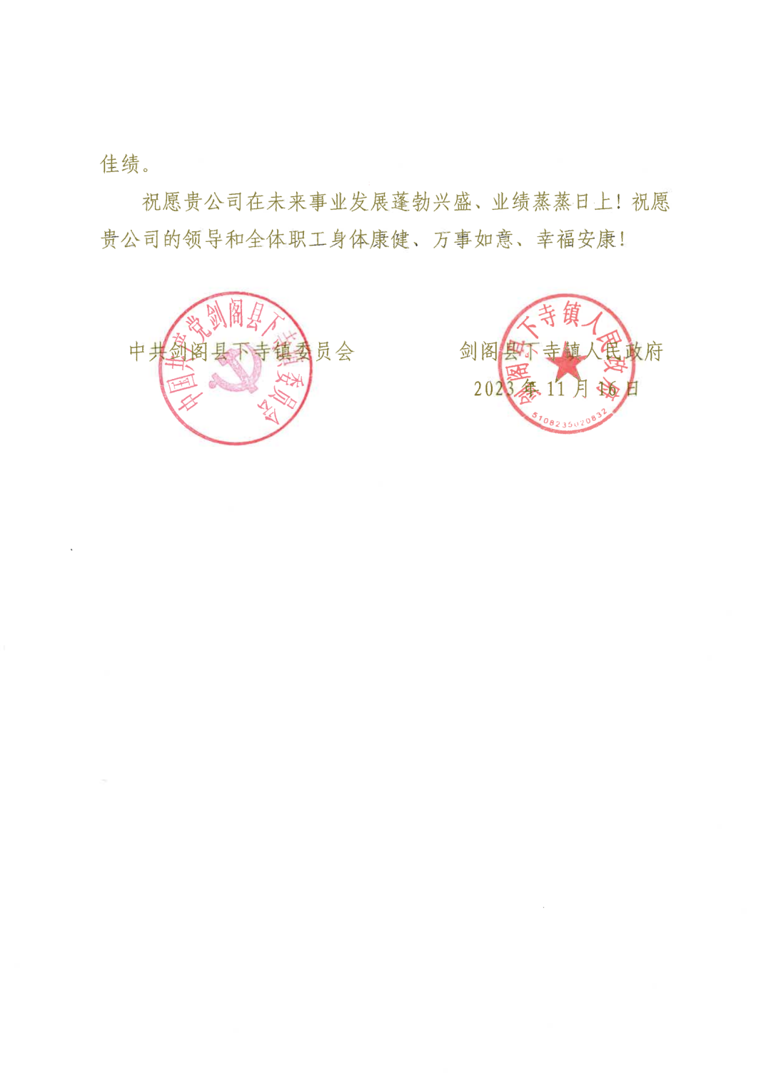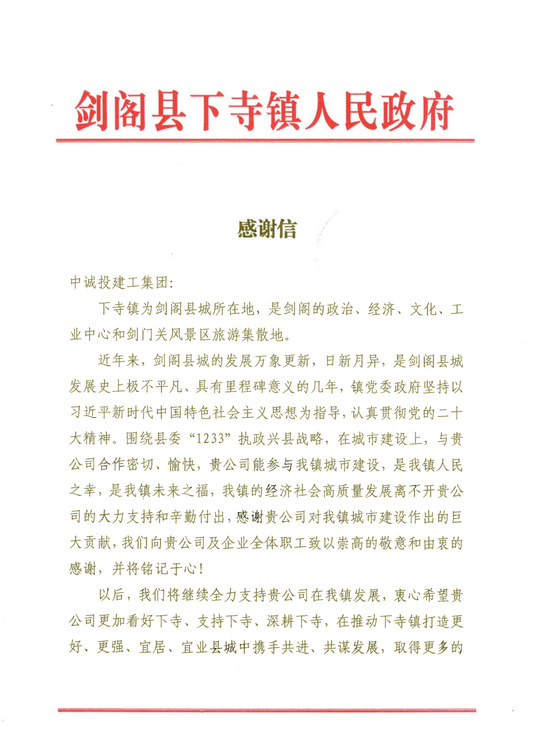 信中,下寺鎮(zhèn)人民政府向中誠投為當(dāng)?shù)爻鞘薪ㄔO(shè)與經(jīng)濟(jì)社會高質(zhì)量發(fā)展作出的重要貢獻(xiàn)致以深深的感謝,并表示將繼續(xù)全力支持中誠投在下寺鎮(zhèn)的項(xiàng)目建設(shè)與發(fā)展,共同打造更好、更強(qiáng)、宜居、宜業(yè)縣城。