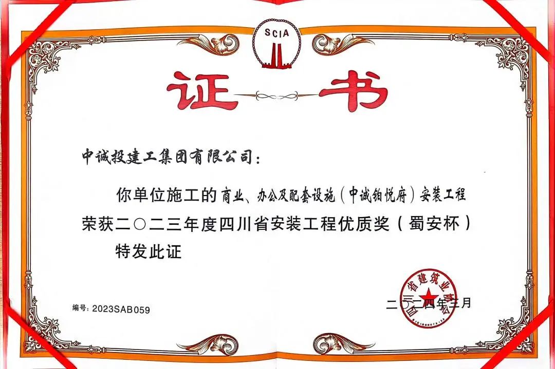 中誠(chéng)·鉑悅府項(xiàng)目榮獲2023年度四川省安裝工程優(yōu)質(zhì)獎(jiǎng)