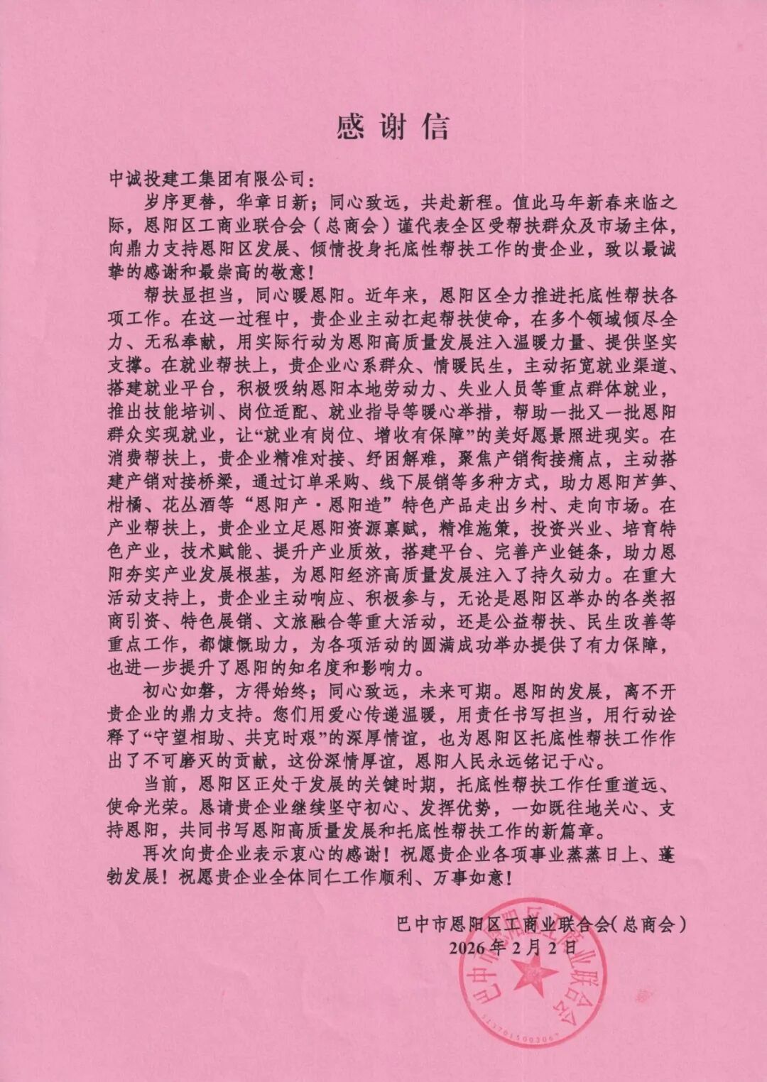 信中,恩陽區工商聯代表全區受幫扶弱勢群體、各類市場主體,向中誠投建工集團兩年多來始終堅守幫扶初心、主動扛起社會責任,在托底性幫扶工作中傾情幫扶、在“新春送溫暖”活動中傳遞溫情的實干舉措,表達了誠摯的感謝,高度肯定了中誠投建工集團“扶危濟困、大愛無疆”的企業擔當和“扎根地方、服務地方”的責任情懷。