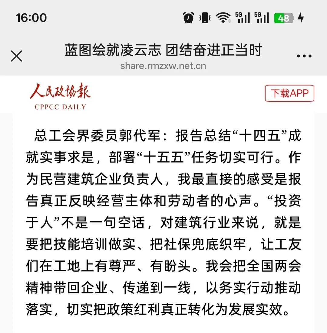針對民營建筑企業面臨的痛點難點,郭代軍委員積極建言發聲,提出應多措并舉為企業紓困賦能,符合國家促進民營經濟發展壯大的政策要求;他強調清理拖欠賬款事關企業生存,直指行業關鍵難題;他關注民營企業人才隊伍建設,呼吁激活人才“蓄水池”,支撐企業轉型升級;他針對平臺公司抽成過高問題,倡導堅持“讓利于民、公平公正”原則,切實維護市場秩序、保障從業人員合法權益,為民營經濟健康發展營造良好環境。