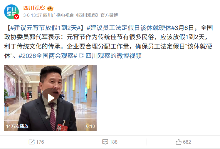在勞動者權益保障與傳統文化傳承方面,郭代軍委員建議嚴格落實帶薪休假制度,積極回應廣大勞動者訴求,并與擴大內需、促進消費升級的政策導向相契合,被網友譽為“懂勞動者的實在建言”;同時,他提議將元宵節增設1至2天假期,以助力傳統文化的活態傳承,呼應公眾情感需求,引發社會廣泛共鳴。